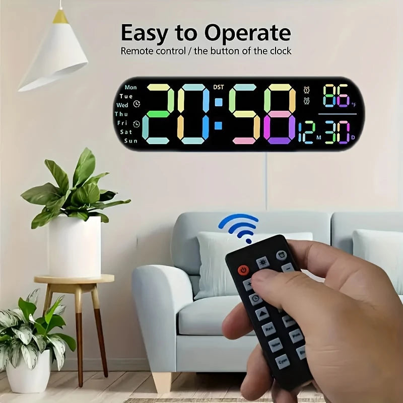 [DIGITAL WALL CLOCK WITH REMOTE CONTROL] The big digital wall clock offers versatile display options, as it can be mounted on the wall or placed gracefully on a desktop. It includes a remote control that can be used up to a distance of 32 feet. This means you can conveniently adjust the clock settings using the remote control. This feature is beneficial for elderly individuals or those with limited mobility, as it provides them with easy access to essential clock functions.